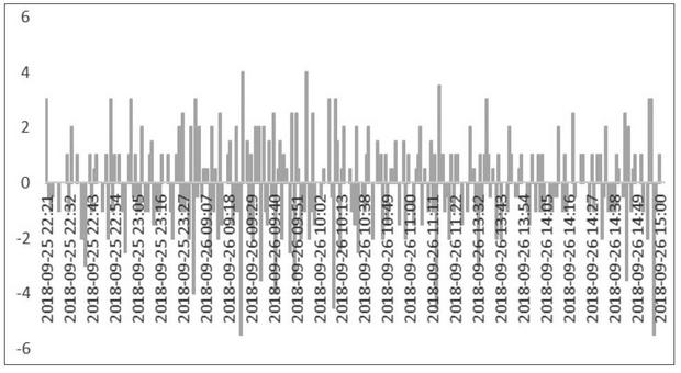 下面以豆粕期货1901合约为例,分别用两种建仓方法构建执行价为3200元/吨的买入跨式期权组合:一是买入M1901—C—3200和M1901—P—3200;二是买入两份M1901—C—3200和M1901空单。计算两种建仓方法的分钟线价差如下图所示: